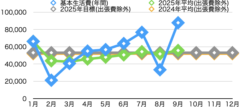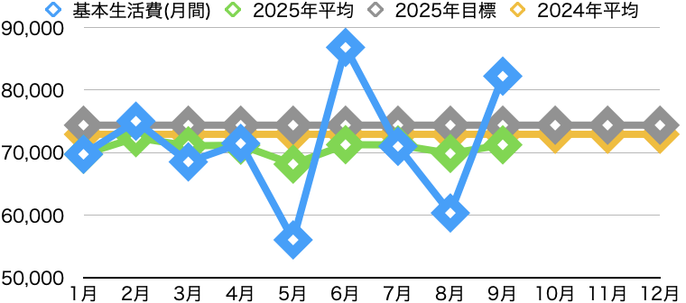 2024年の支出データから、2025年の目標は2024年の+2%に抑えることとし、基本生活費(月間)の2025年目標を74,385円/月に設定しております(グレー線)。