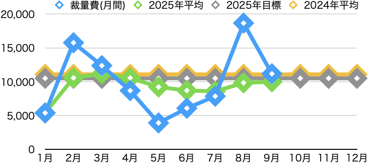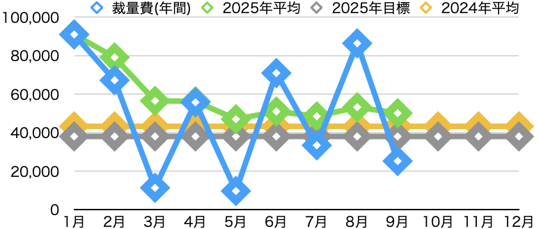 横軸に年月、縦軸が金額なのですが、各月の金額と2025年の平均、2025年の目標、そして2024年の平均を示しております。