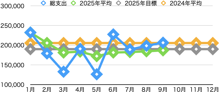 最後に9月の支出と今月までの2025年平均、さらに2024年平均を表示します。
