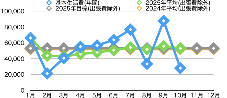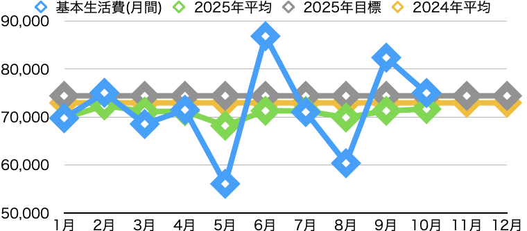 2024年の支出データから、2025年の目標は2024年の+2%に抑えることとし、基本生活費(月間)の2025年目標を74,385円/月に設定しております(グレー線)。