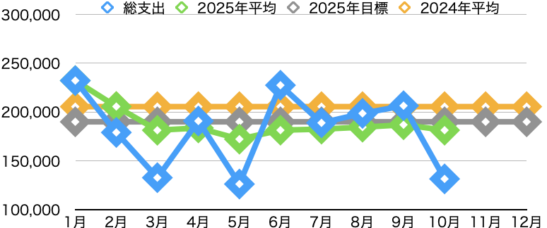 以下に10月の支出と今月までの2025年平均、さらに2024年平均を表示します。